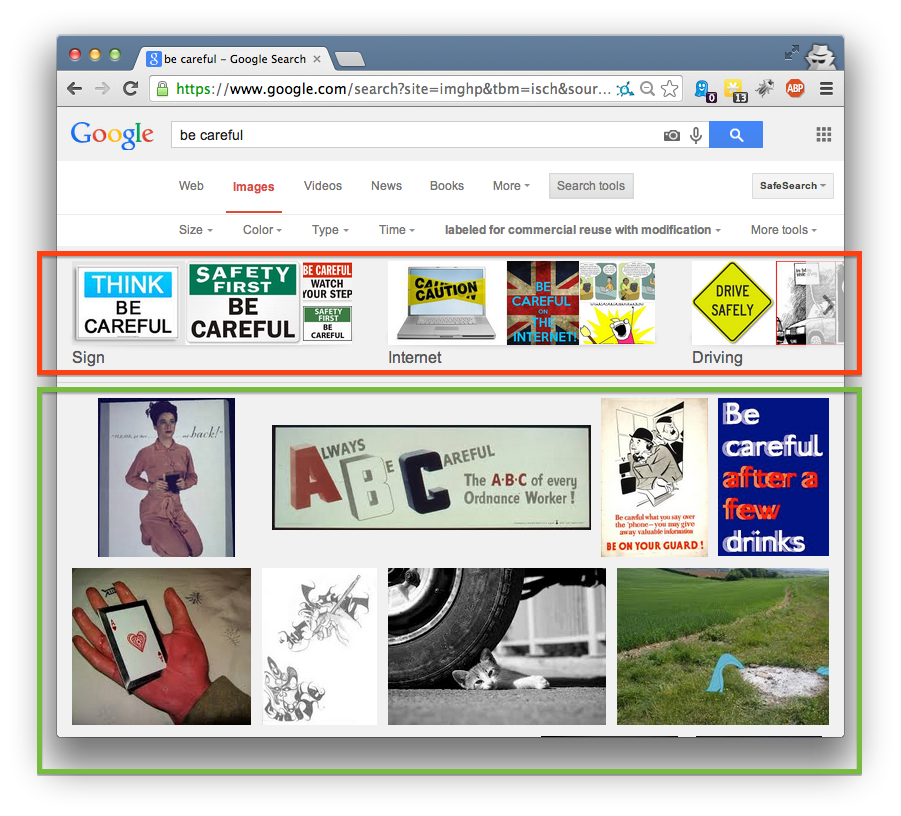 In de voorbeeld afbeelding hierboven hebben we gezocht op “be careful” met gebruiksrechten die commercieel gebruik en aanpassingen toestaan. Rood omlijnt zie je zoekresultaten waarbij je er niet uit van kan gaan dat je deze kan gebruiken. Groen omlijnt zijn de daadwerkelijke zoekresultaten met de gebruiksrechtenfilter.