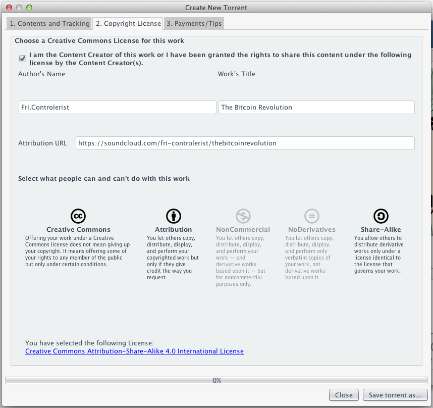 FrostWire, een programma wat ervoor zorgt dat je peer-to-peer torrents kan delen, heeft bekend gemaakt dat ze Creative Commons-licenties hebben geïntegreerd. Bij het uploaden van een torrent kun je nu gemakkelijk aangeven wat de gebruikersrechten van de ontvanger zijn. Je kunt met knoppen de 4 bouwstenen van Creative Commons aanklikken om tot een van de zes mogelijke licenties te komen. Zo kun je besluiten of mensen commercieel gebruik kunnen maken van je werk, of ze afgeleide werken mogen delen of dat er geen restricties zijn behalve naamsvermelding.